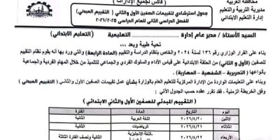 في هذا السياق، نشر موقع صوت العرب جدول التقييمات المبدئية للصفين الأول والثاني الابتدائي التي تم الإعلان عنها في مختلف المحافظات وأكدت مديريات التربية والتعليم أنه في حال عدم اجتياز أي من التلاميذ لهذه التقييمات، سيتم تطبيق برنامج علاجي لمساعدتهم على اجتياز التقييم النهائي وستقوم الوزارة بإخطار أولياء الأمور بمواعيد التقييم النهائي والتعليمات اللازمة.