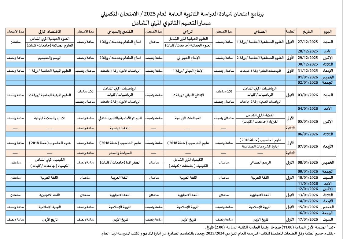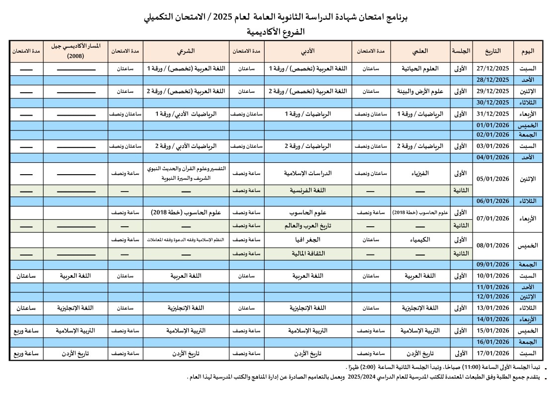 من المقرر ان تنطلق امتحانات الثانوية العامة للامتحان التكميلي 2025 بالأردن يوم السبت الموافق 27 ديسمبر 2025، على أن تستمر المواعيد المقررة حتى يوم السبت 17 يناير 2026، وتم تحديد توقيت الجلسة الأولى يوميًا عند الساعة الحادية عشرة صباحًا، بينما تعقد الجلسة الثانية في تمام الساعة الثانية ظهرًا، وفق البرنامج المعتمد للامتحانات.